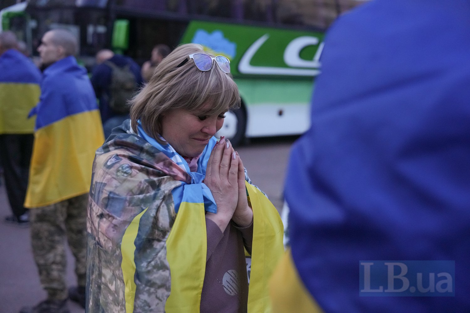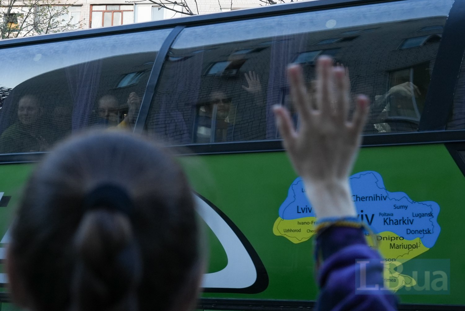 Коли нарешті зʼявляються автобуси, які везуть наших хлопців, всі починають махати руками та прапорами.