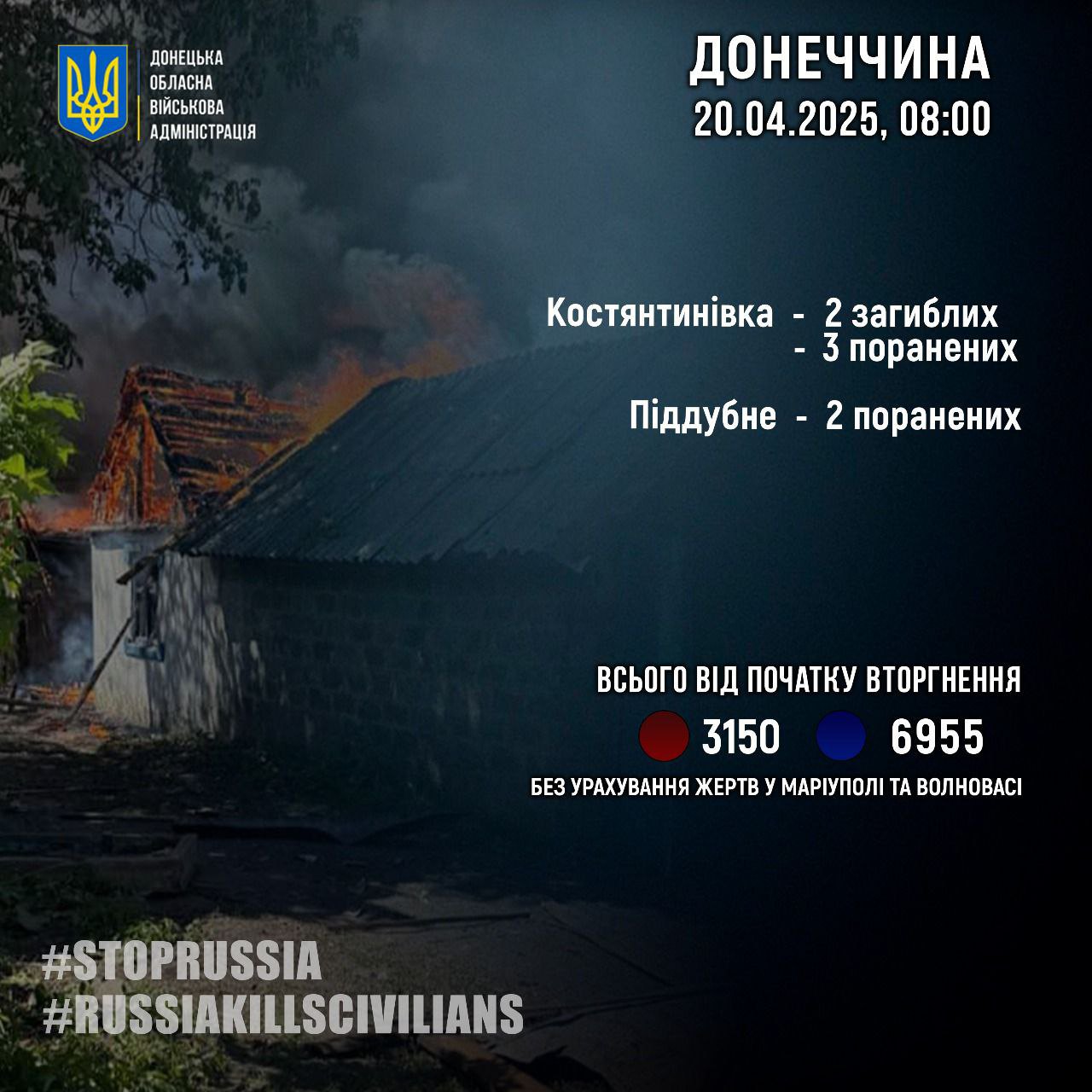 Від початку повномасштабного вторгнення російська армія вбила 3150 цивільних у Донецькій області, поранені — 6955 людей.