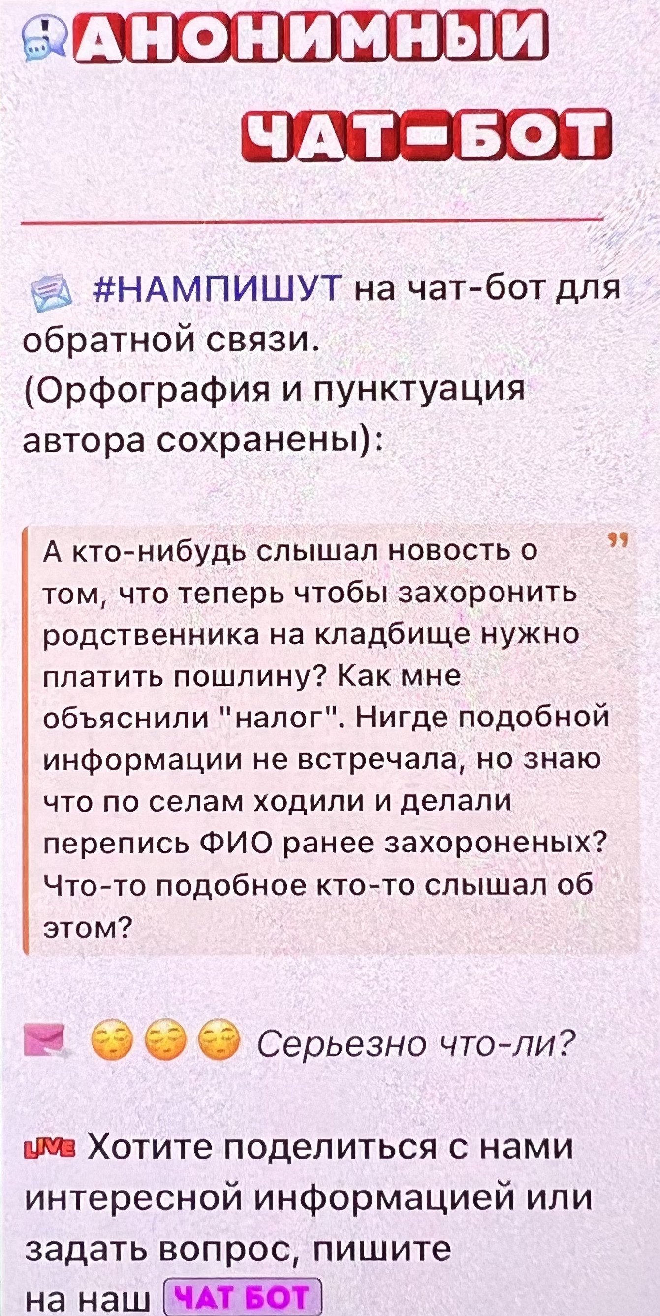 Про це написала анонімна користувачка: «А хтось чув новину: щоб поховати рідну людину треба платити «госпошлину»? Як мені пояснили — «податок». Ніде подібної інформації не чула, але знаю, що вже стали по селах ходити і робит перепис раніше захоронених».