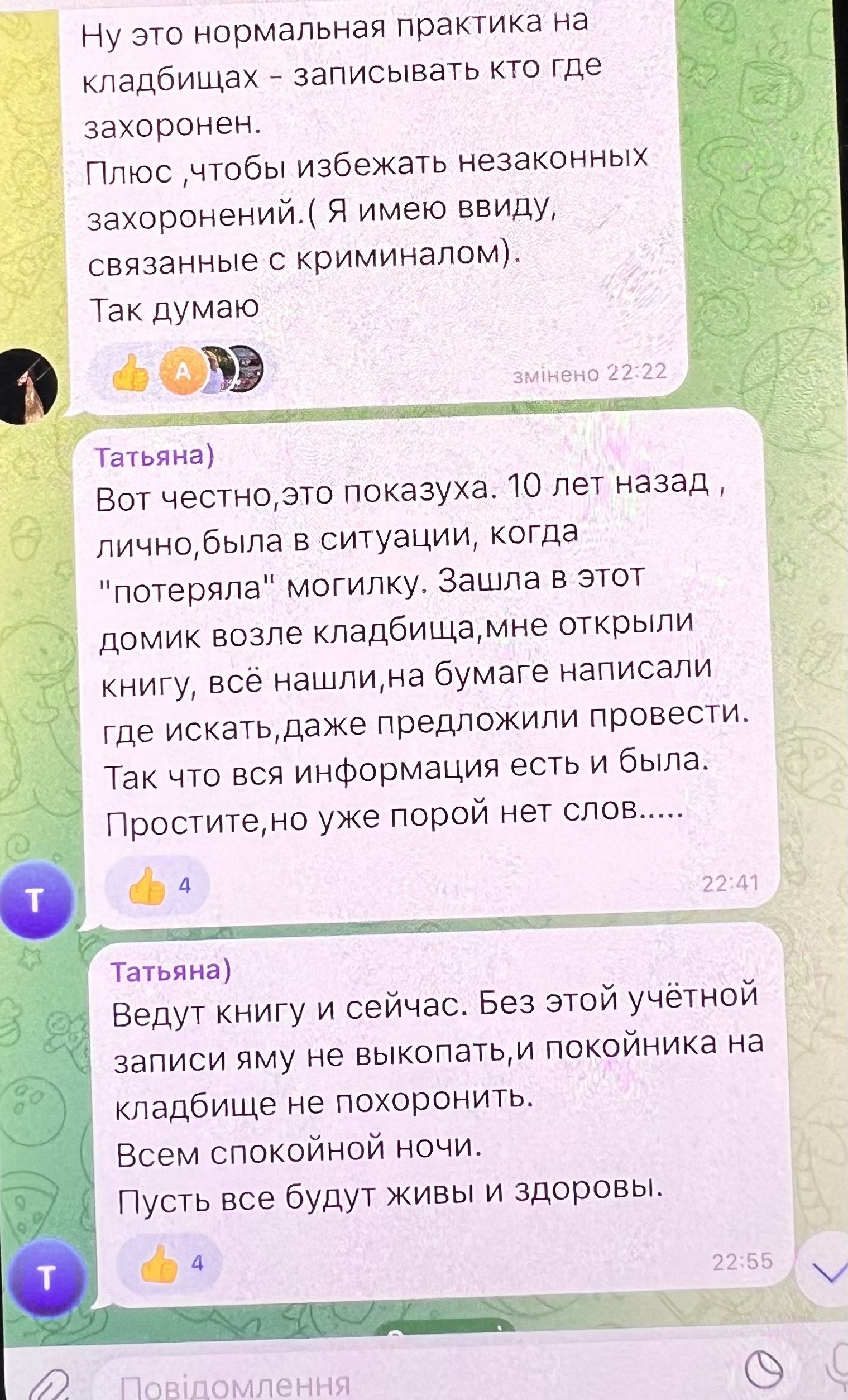 «Сьогодні була на міському кладовищі. Там почали робити інвентаризацію, будуть створювати архівну книгу, вже навіть стали на памʼятники клеїти номери та записувати в журнал. Якщо памʼятник невідомий, то просто ліплять номер і вносять у план, де поховано. Отак мені це пояснили», — пише вона (цитата перекладена з російської мови. — Ред.).