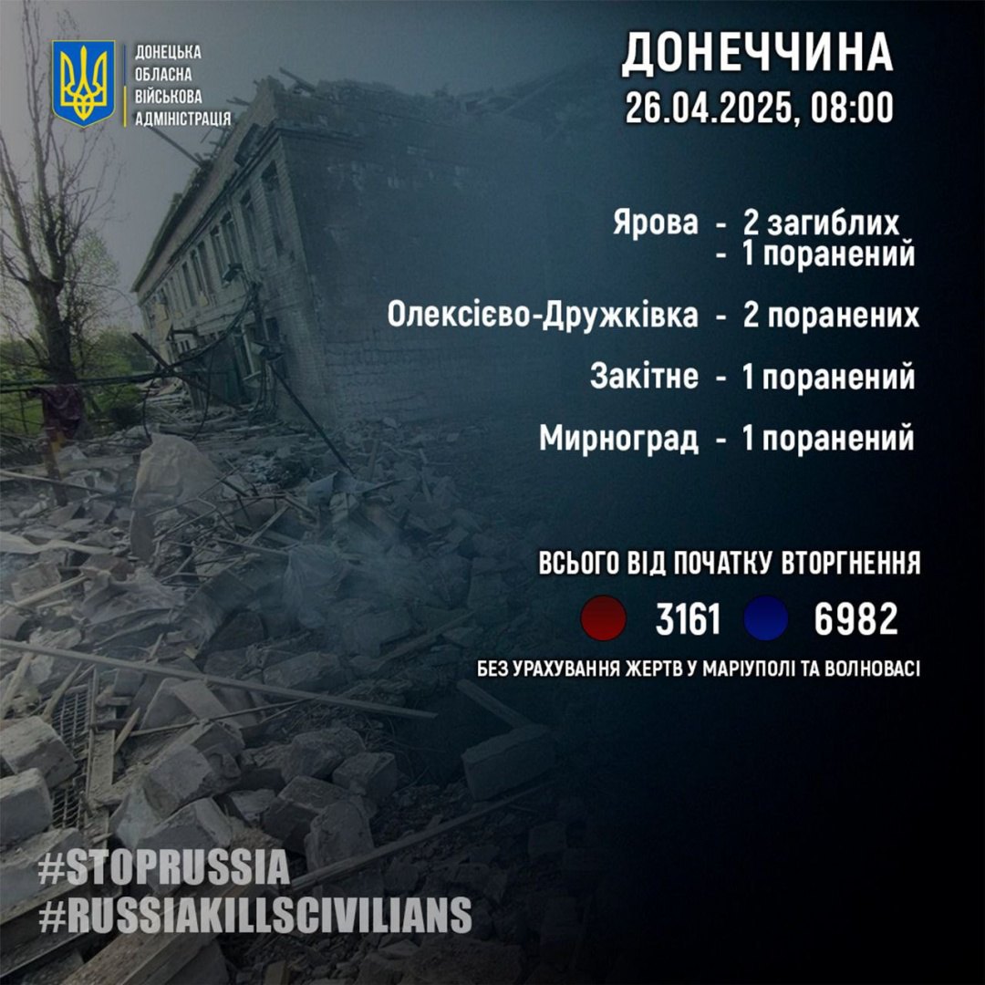 "За 25 квітня росіяни вбили 2 жителів Донеччини: у Яровій. Ще 5 людей в області за добу дістали поранення", — ідеться у повідомленні.