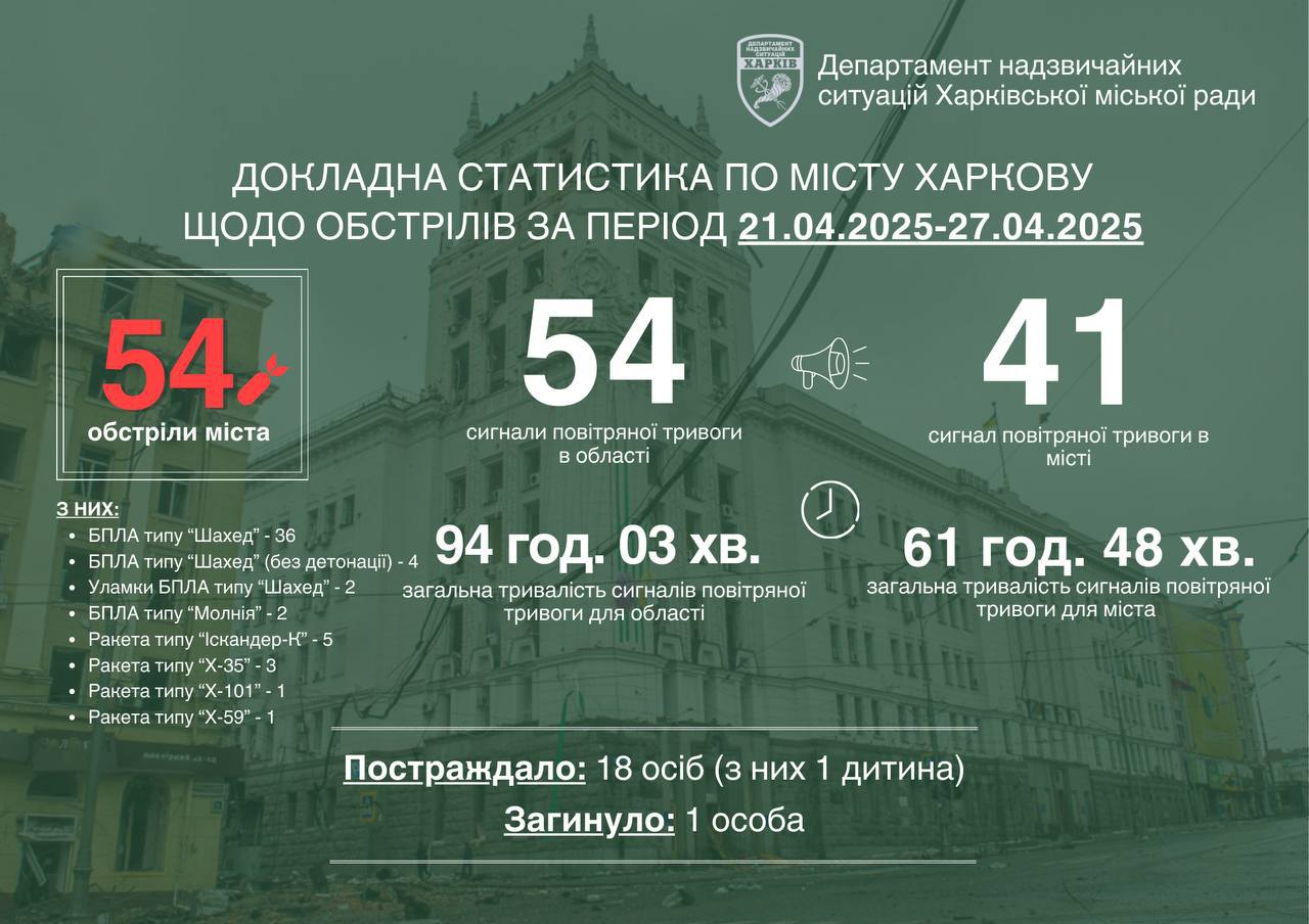 За тиждень, що минув, Харків пережив 54 обстріли. Лише понеділок і неділя були відносно спокійними. Загалом інтенсивність атак зросла в рази.