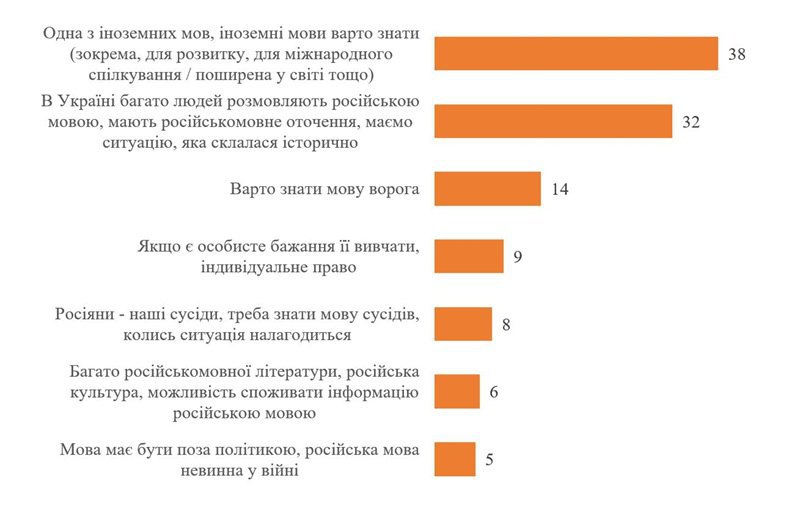 Серед причин, чому російську мову можна вивчати, найбільш поширені пояснення - це те, що російська мова є однією з іноземних мов, а іноземні мова загалом варто знати (38% серед таких респондентів дають це пояснення), а також те, що ця мова поширена в Україні і є обставини, які склалися історично (32%). До топ-3 відповідей також належить думка, що варто знати мову ворога (14%).