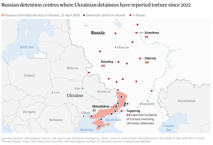 Журналісти The Guardian та інших медіа, які займалися розслідуванням злочинів Росії проти полонених українців, підтвердили систематичне застосування тортур у 29 місцях утримання. 18 з них – у Росії, 11 – на окупованій території. Загалом там може розміщуватися не менше 18 000 людей. Журналісти зафіксували 695 окремих форм тортур. Інформація свідчить про те, що українських ув'язнених розкидали по всій Росії.