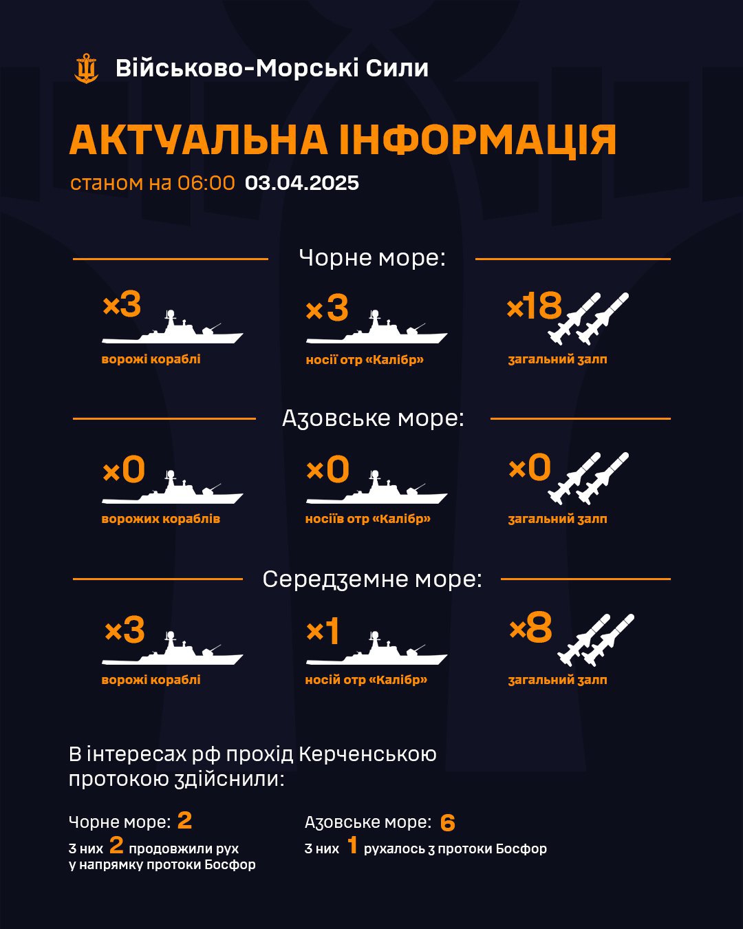 В Азовському морі ворожі кораблі відсутні, у Середземному морі зафіксовано 3 ворожі кораблі, з яких 1 є носієм крилатих ракет "Калібр" загальним залпом до 8 ракет.