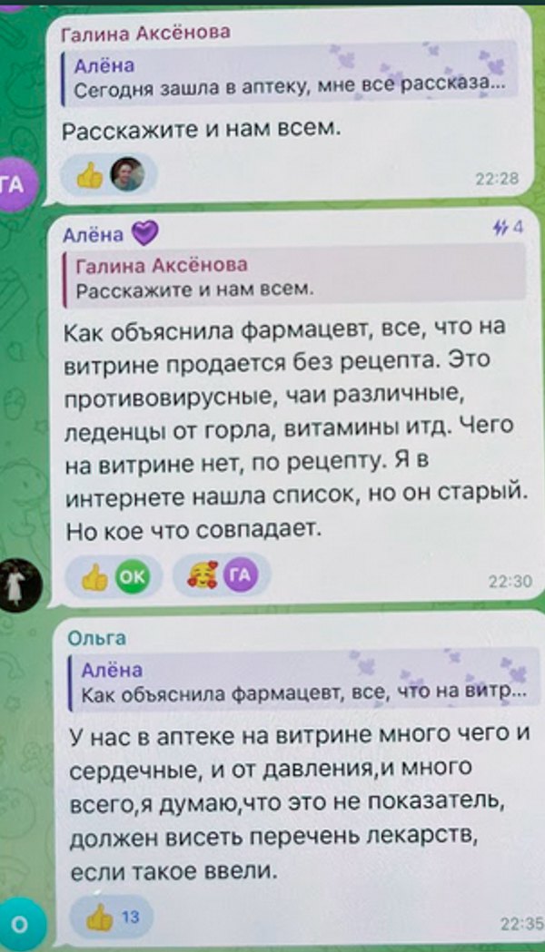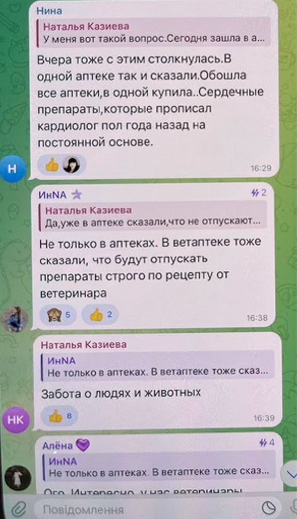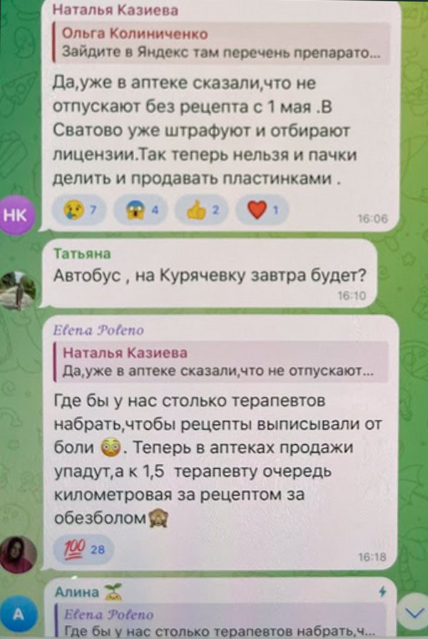 “Так, в аптеці уже сказали, що не відпускають без рецепта з 1 травня. В Сватово вже штрафують і відбирають ліцензії. Так тепер не можна і пачки ділити, і пластинками продавати”, - пише (російською) користувачка “Наталья Казиева” в місцевому телеграм-каналі.