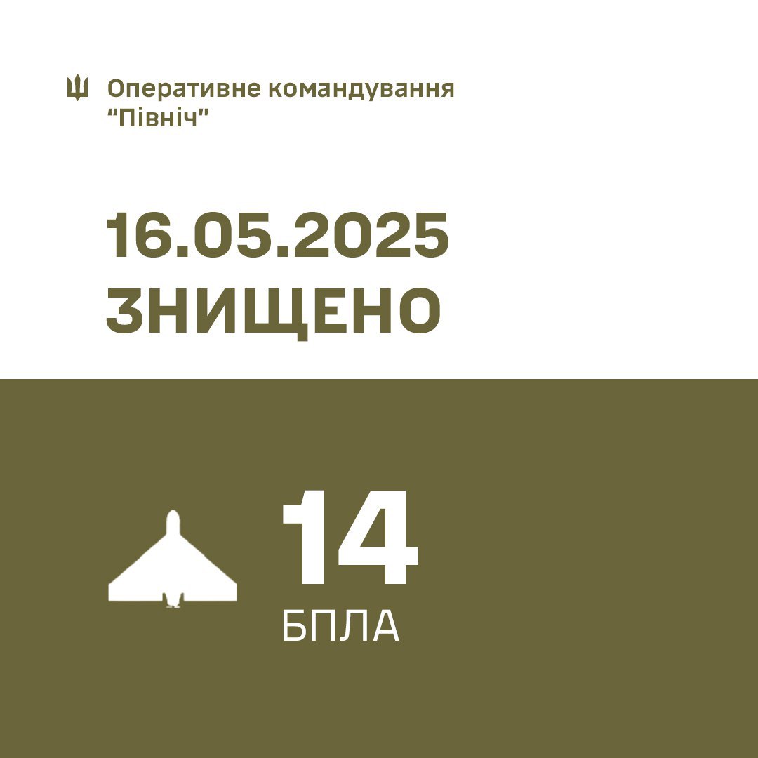 - У ніч на 17 травня РФ атакувала Україну 62-ма ударними БпЛА типу Shahed і безпілотниками-імітаторами різних типів із напрямків: Курськ, Орел, Шаталове – РФ., Гвардійське — ТОТ Крим.