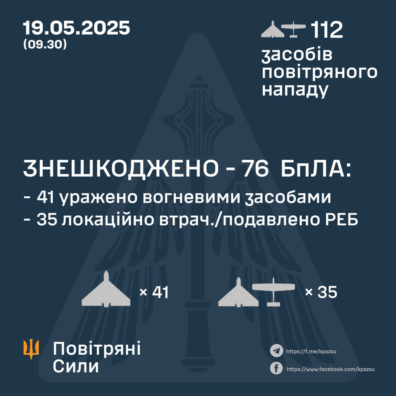 У ніч на 19 травня протиповітряна оборона України знешкодила 76 із 112 запущених Росією дронів.