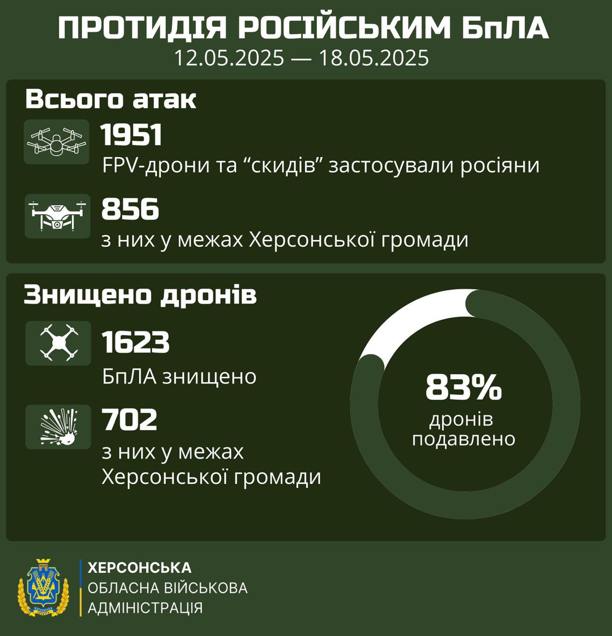 "За минулі сім днів російські війська запустили по звільненій Херсонщині 1950 дронів. Окупанти цілилися в мирних людей та цивільну інфраструктуру", – йдеться у повідомленні.