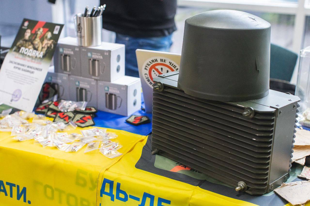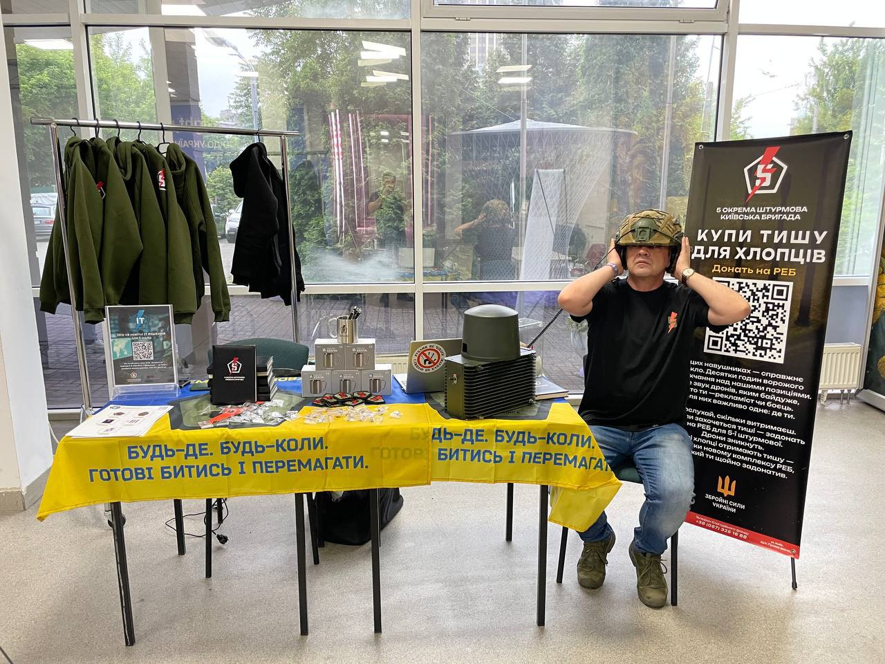 Щоб заглушити цей гул у реальності, потрібна підтримка - донат. Поруч з інсталяцією, мерч-зона, де можна придбати шеврони “п’ятірки”, худі з логотипом 5-ї штурмової, сувенірні гільзи тощо. Також можна задонатити на засоби зв’язку та захисту слуху для військових.