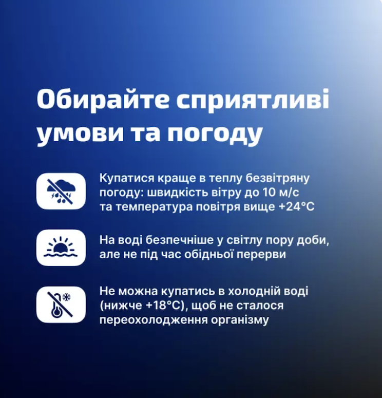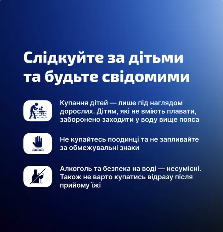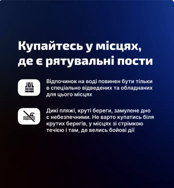 "Варто бути обережними біля водорізів. Не пірнайте з них, бо можна впасти – вони дуже слизькі від водоростей. Не запливайте за буйки! Великою бідою може обернутися пірнання на мілководді або в незнайомих місцях. У таких випадках можливі травми шийного відділу хребта з пошкодженням спинного мозку", – застерегли в ДСНС.