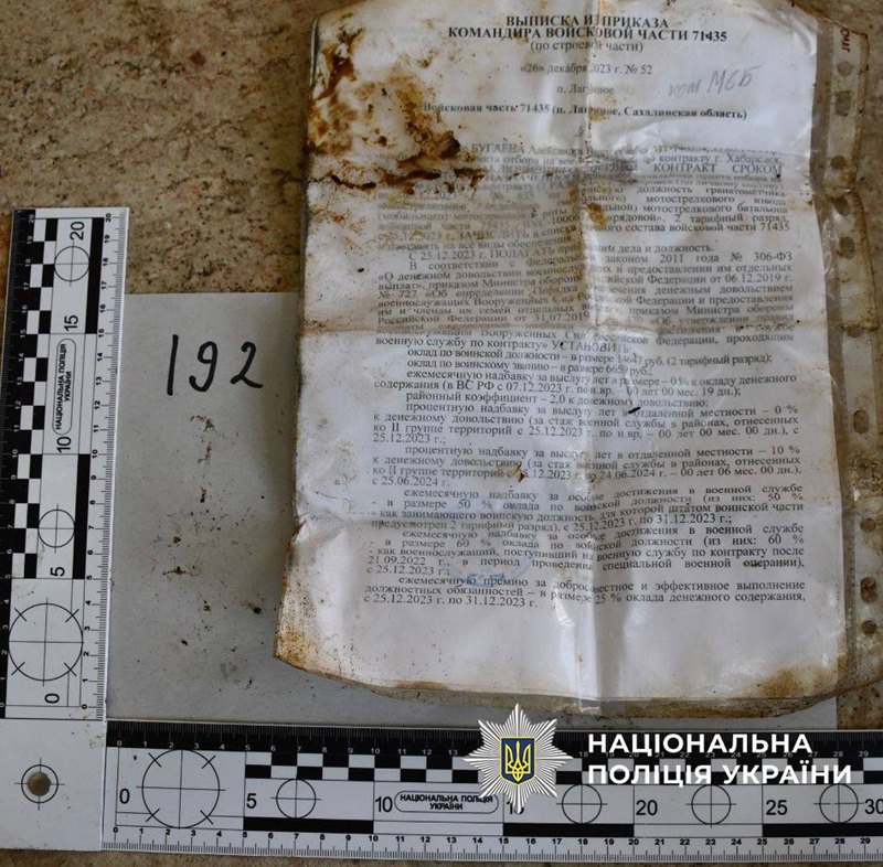 Зокрема, йдеться про труп №192/25, одягнений у форму зразка ЗС РФ. При ньому - паспорт громадянина РФ, військовий квиток, талон атестату військовослужбовця №1252, виписки з наказу командира в/ч №52 від 26.12.2023, жетон з написом: "ВС РОССИИ МТ-146004".