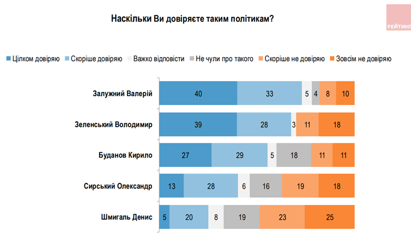 Колишній головнокомандувач Збройних Сил України Валерій Залужний, який нині є послом у Великій Британії, очолив рейтинг довіри українців. Йому цілком довіряють 40% опитаних, а ще 33% заявили, що радше довіряють, ніж не довіряють. Водночас 10% висловили недовіру ексголовкому, а 8% заявили, що радше не довіряють.