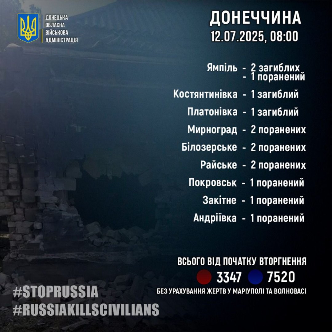 За добу 11 липня росіяни вбили чотирьох жителів Донеччини: двох цивільних у Ямполі, по одному у Костянтинівці і Платонівці.