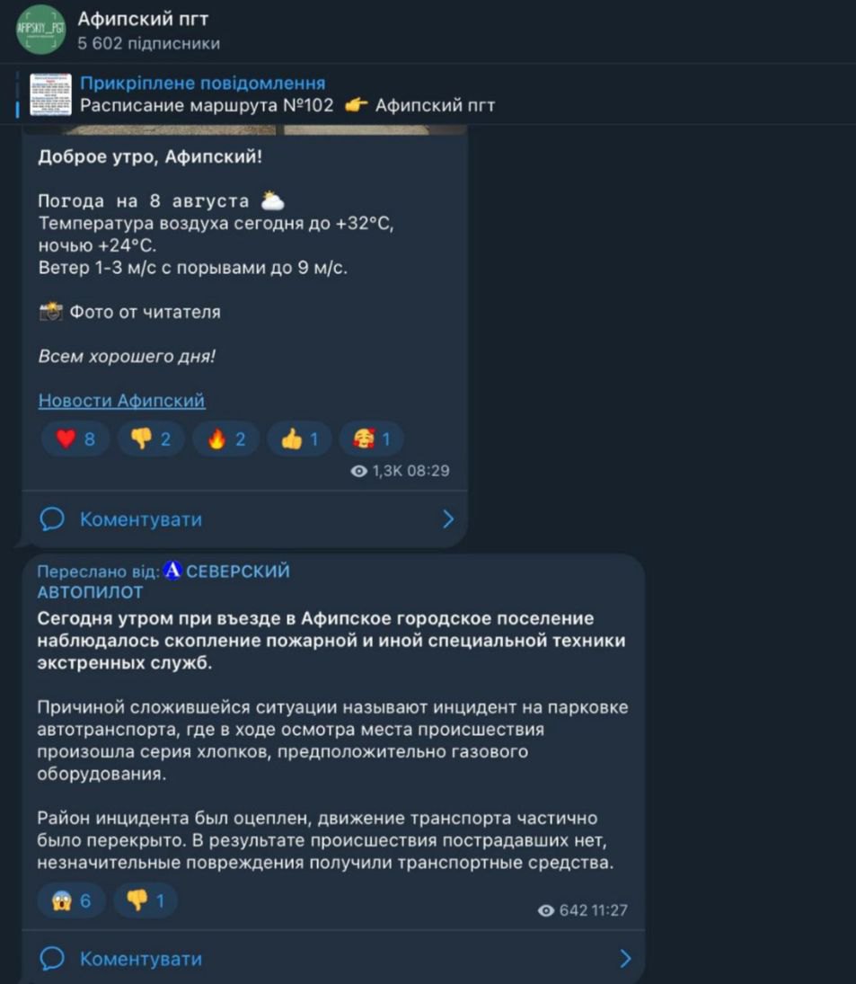 Місцеві ЗМІ та пабліки у соцмережах повідомили про два вибухи в смт Афіпське, а місцевими спецслужбами було перекрито район та запроваджено режим "антитерористичної операції".