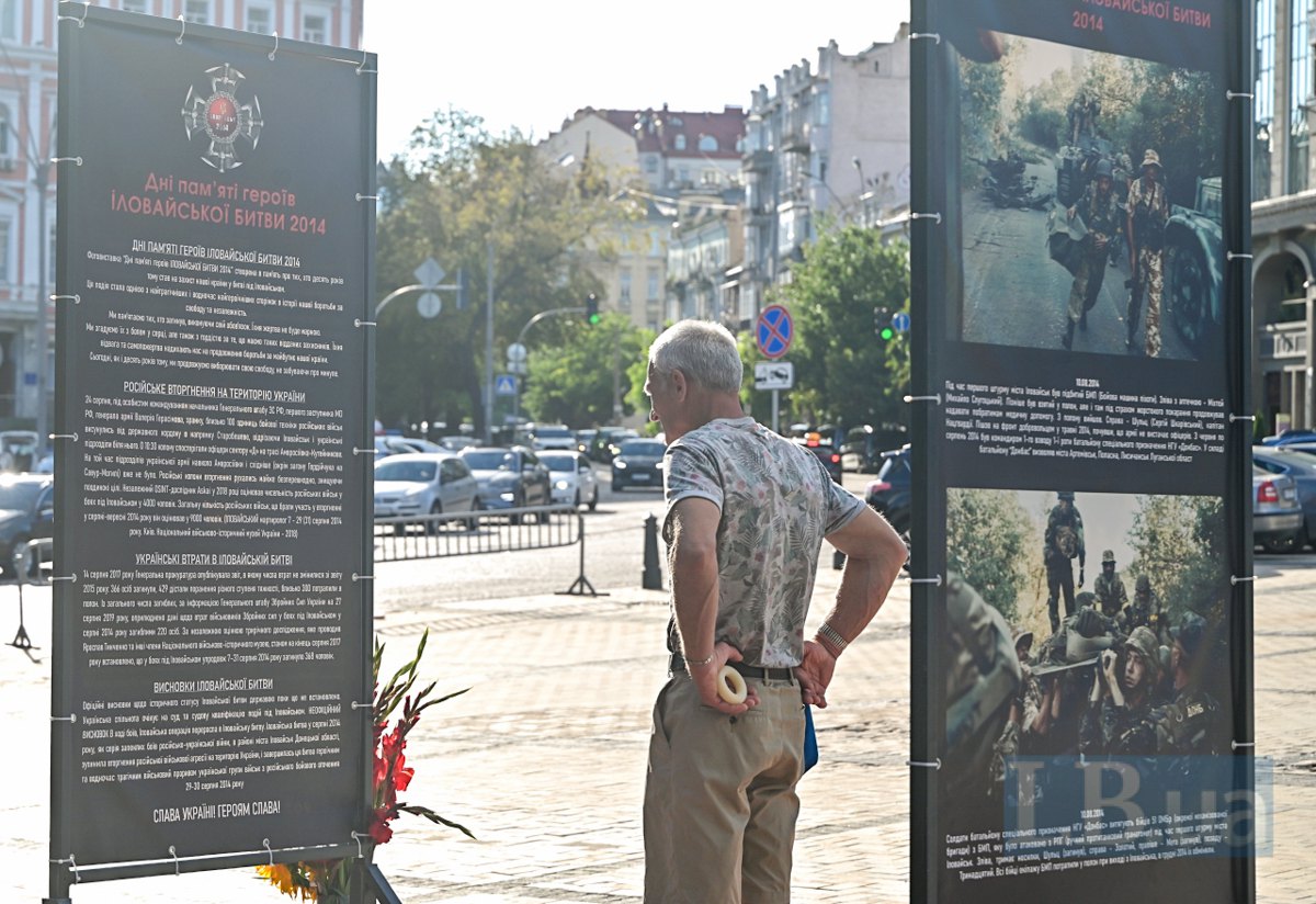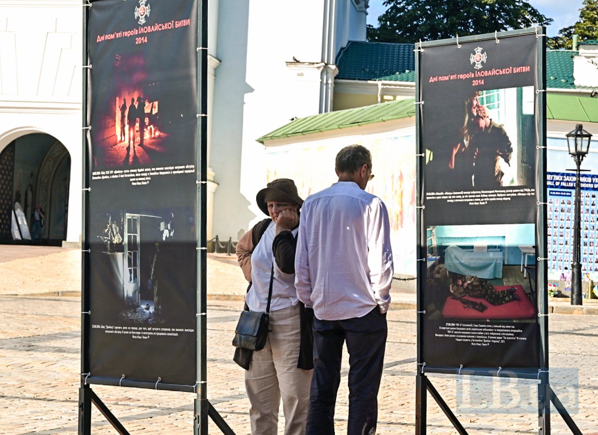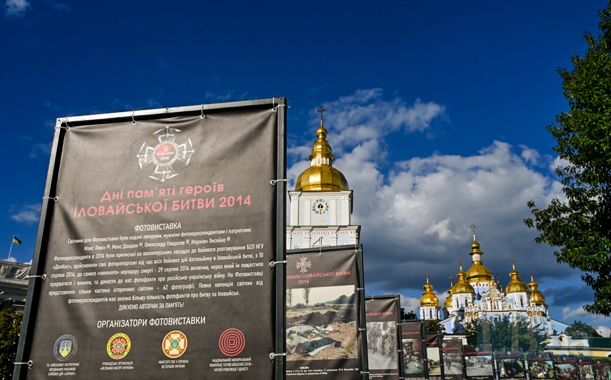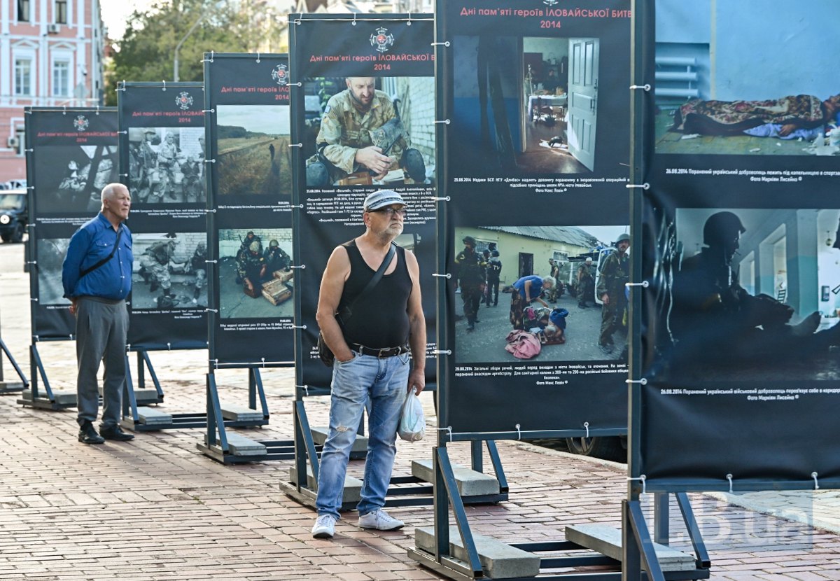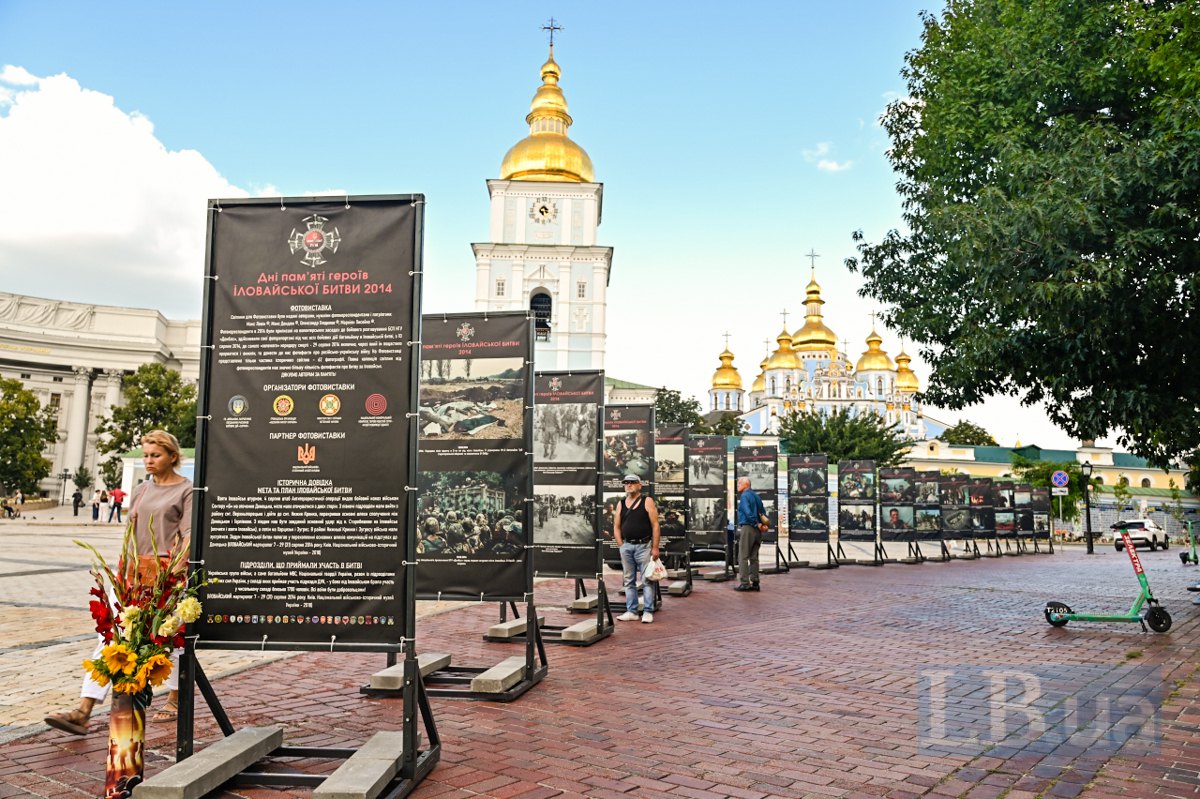 Сьогодні на Михайлівській площі в Києві відкрилася фотовиставка "Дні пам’яті героїв Іловайської битви 2014", присвячена пам'яті тих, хто одинадцять років тому став на захист нашої країни у битві під Іловайськом.