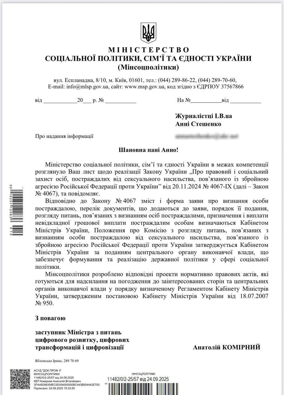 Нагадаємо, LB.ua докладно писав про те, як у червні 2025 року набрав чинності закон України про статус постраждалих від сексуального насильства, пов’язаного з конфліктом (СНПК). Однак Мінсоцполітики досі не створило комісію, яка мала б продовжити виплати.