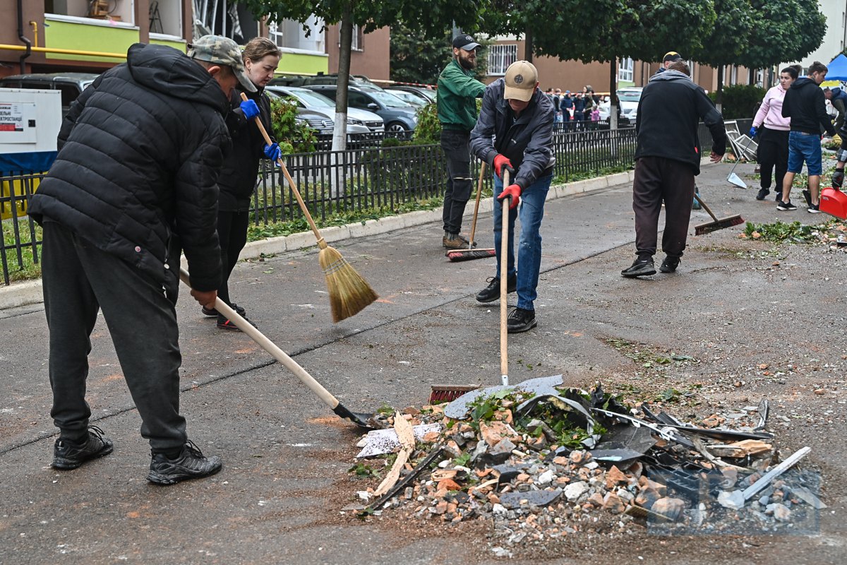 Люди вийшли на вулицю прибирати наслідки російського удару по вулиці.