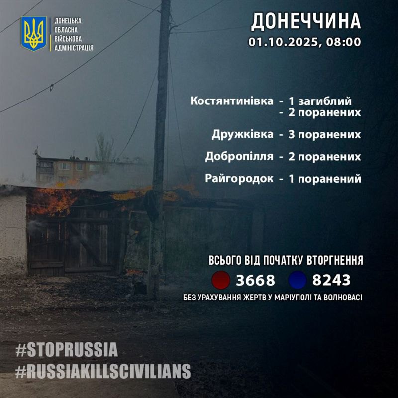 Протягом минулої доби у Донецькій області внаслідок російських обстрілів загинула людина, 8 людей отримали поранення.