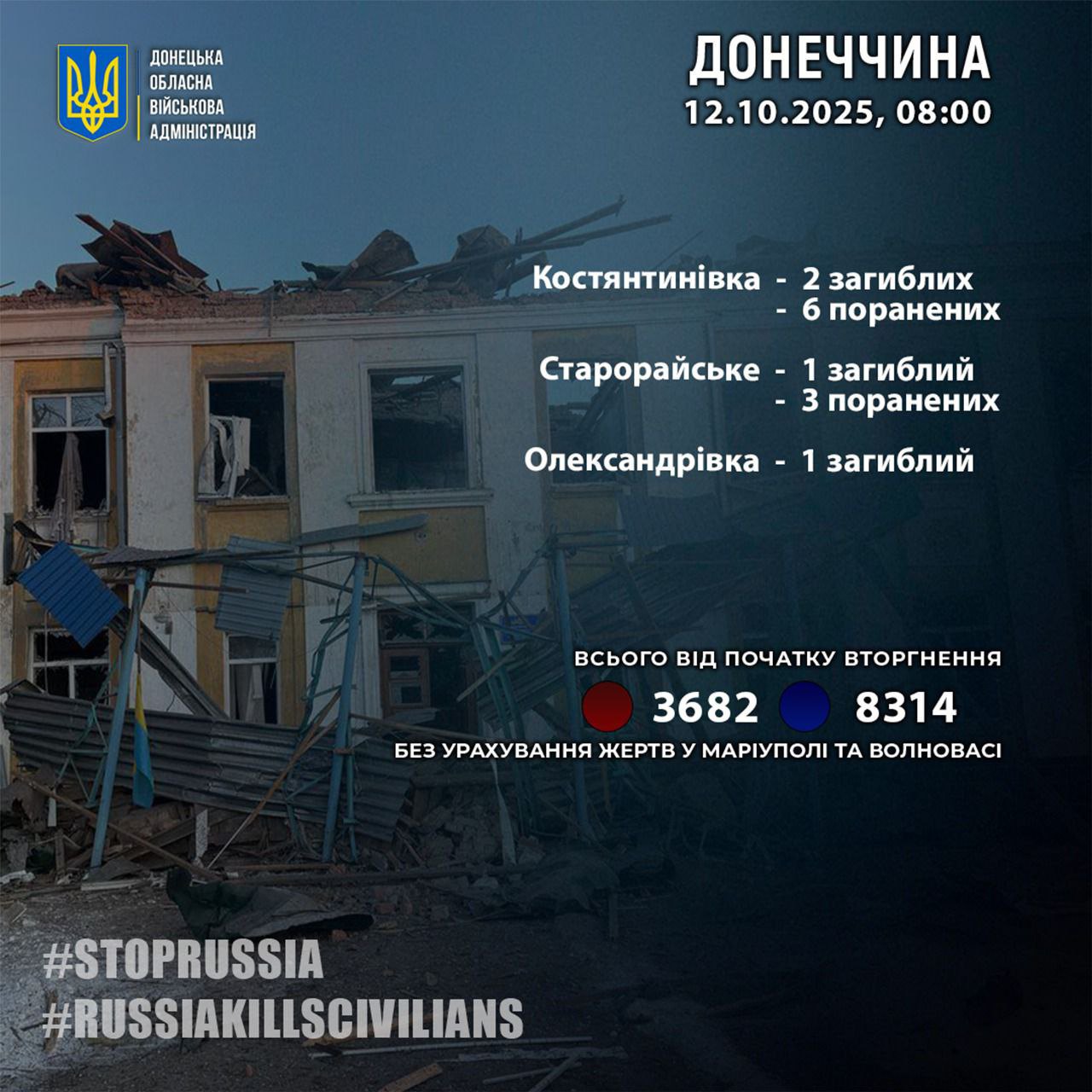 Також, за інформацією Філашкіна, за добу на Донеччині через російські обстріли загинули 4 жителів: 2 у Костянтинівці, по 1 у Старорайському та Олександрівці. Ще 9 людей в області за добу дістали поранення.