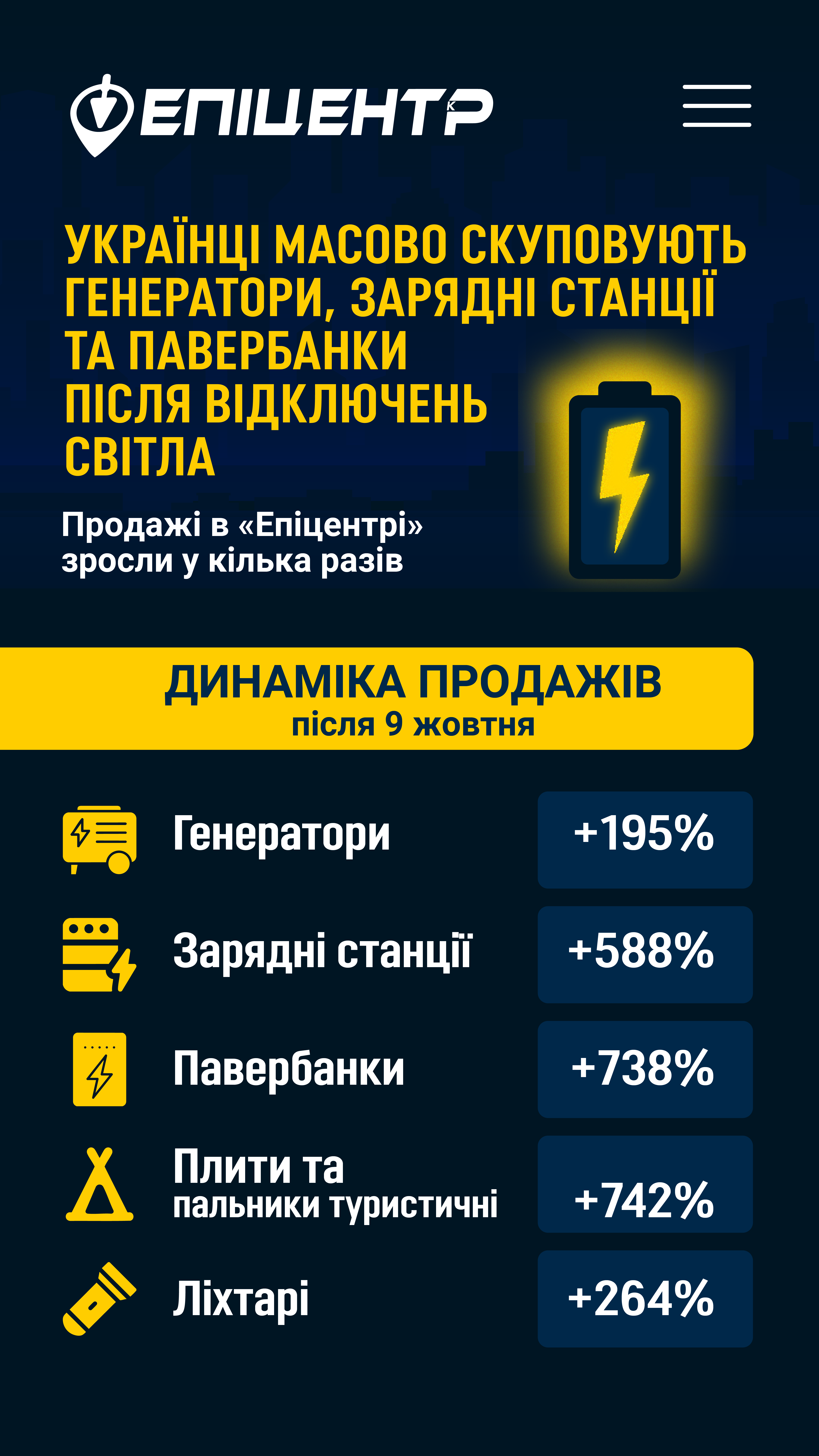 Після масованих обстрілів енергетичної інфраструктури та віялових відключень світла по Україні, мережа торговельних центрів Епіцентр зафіксувала різке зростання попиту на товари для автономного енергозабезпечення.