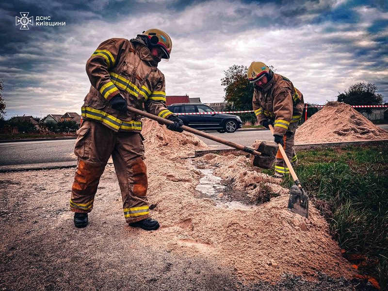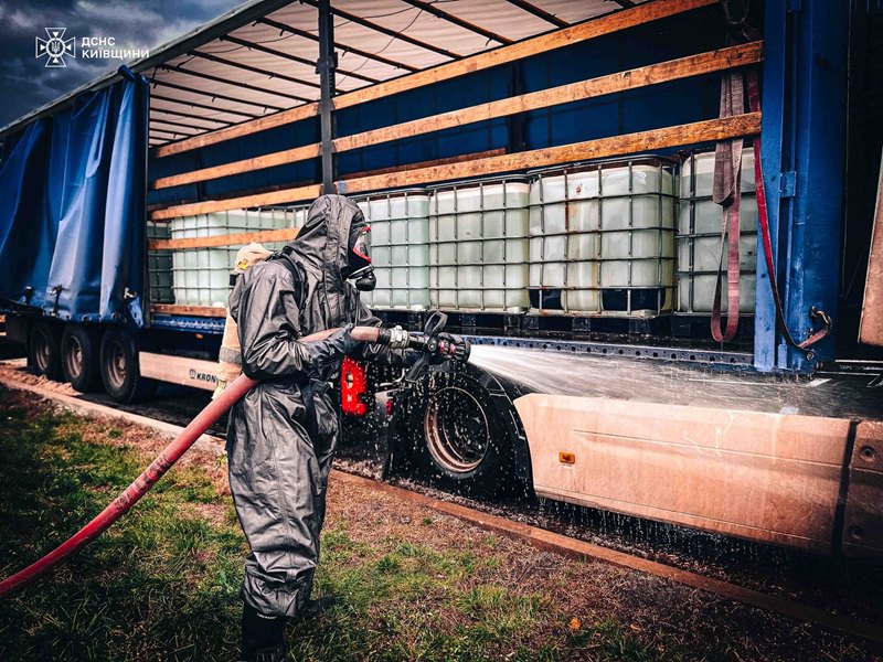 На автодорозі в селі Росава, Обухівського району Київської області стався розлив близько 1 кубометра азотної кислоти з цистерни.