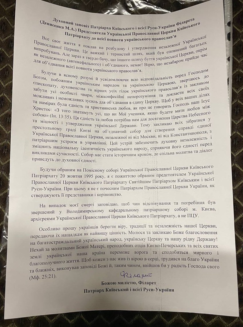 96-річний Патріарх Філарет написав духовний заповіт, у якому закликав представників українського православ’я об’єднатися в єдину церкву — "незалежну ні від Москви, ні від Константинополя", ідеться в опублікованому на сайті УПЦ КП документі.