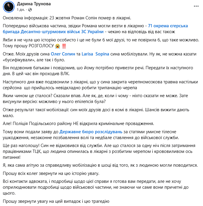 “Отже. Сина моїх друзів Олега та Лариси Сопіних мобілізували. Ну як, не можна казати «бусифікували», але так і було. Він подзвонив батькам і повідомив, що йому потрібно привезти речі. Передати їх наступного дня. В цей час він проходив ВЛК. Наступного дня вже подзвонили з лікарні, що у сина закрита черепно-мозкова травма настільки серйозна, що прийшлось невідкладно робити трепанацію черепа. Яким чином це сталося? Сказали впав. Але як, де, коли і чому - ніхто сказати не може. Зате висунули версію: можливо у нього епілепсія була”, – розповіла ведуча.