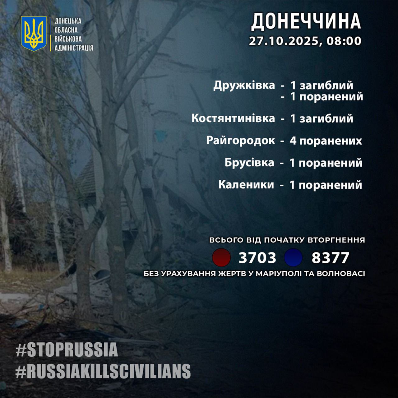 За 26 жовтня росіяни вбили у Донецькій області двох людей.