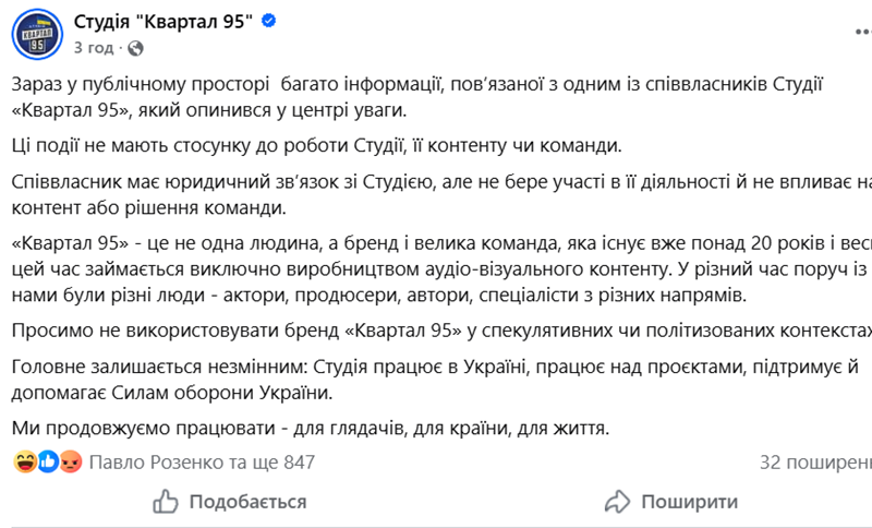 "Просимо не використовувати бренд «Квартал 95» у спекулятивних чи політизованих контекстах", - йдеться в повідомленні.
