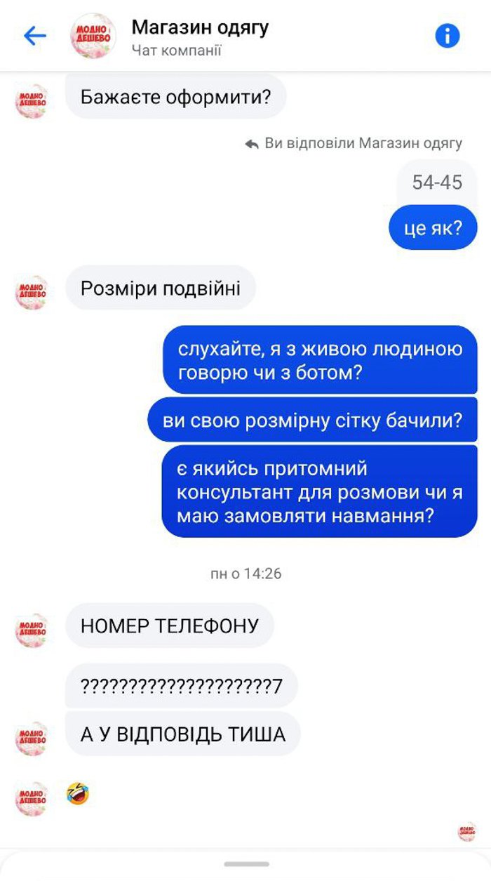 У приватній переписці користувача зазвичай зустрічають боти. Порозумітися з ними часто так складно, що починаєш підозрювати, чи не з якимось вишуканим шахрайством чи ворожим фейкоробством маєш справу. Бо коли ставиш прямі питання: чому плутаєтеся в розмірах і цінах, чи можна поспілкуватися з оператором тощо – сторінка користувача блокує і навіть відгука залишити немає де.