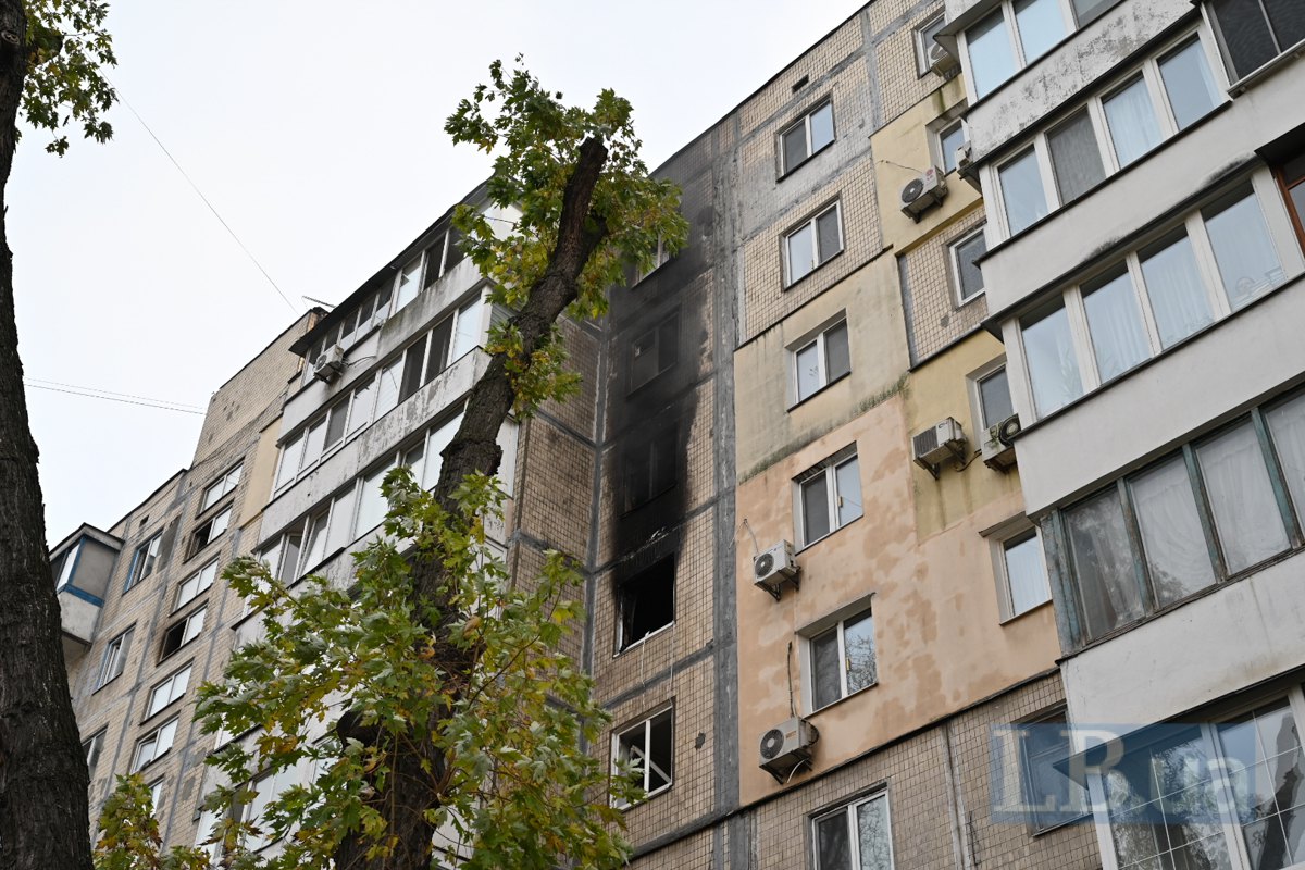 У Печерському районі влучання у 22-поверховий будинок, внаслідок якого є руйнування, виникла пожежа. Медики надали допомогу одній жінці із гострою реакцією на стрес.