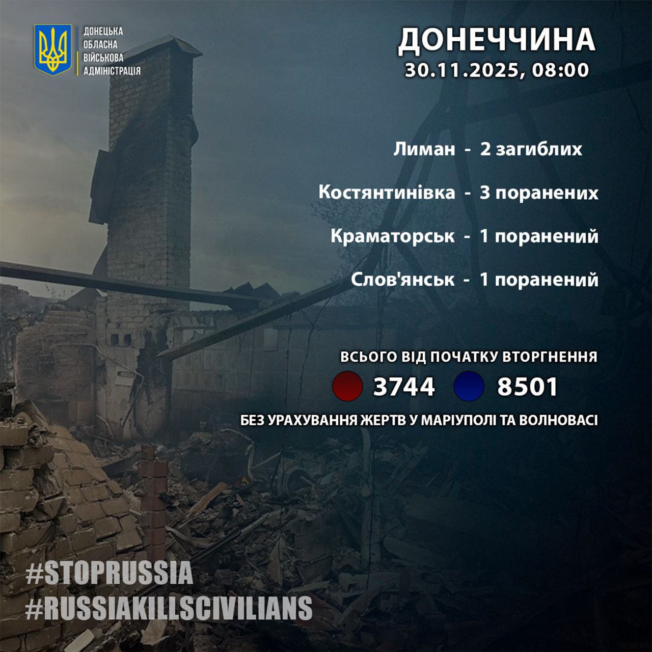 "За 29 листопада росіяни вбили двох жителів Донеччини — у Лимані. Ще 5 людей в області за добу дістали поранення", – ідеться у повідомленні.