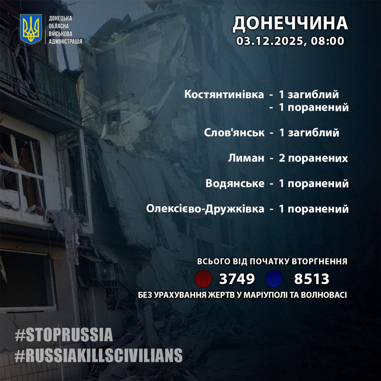 З початку вторгнення РФ загальна кількість жертв росіян на Донеччині становить 3749 осіб, поранення отримали 8513 людей. Цифри подані без урахування Маріуполя та Волновахи.