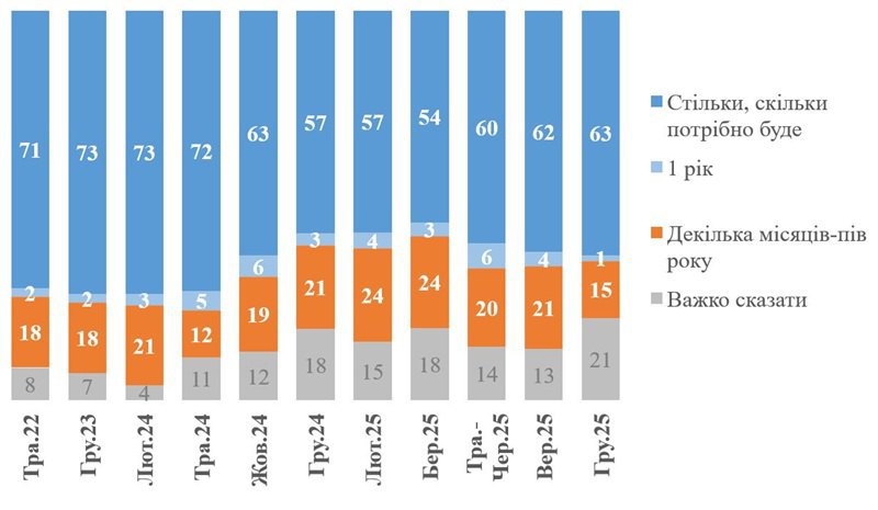При цьому більшість українців (63%) продовжують відповідати, що вони готові терпіти війну стільки, скільки потрібно (у вересні було 62%). Ще 1% відповіли, що готові терпіти близько року.