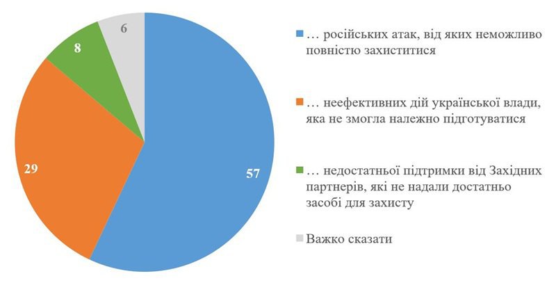 Водночас 29% покладають відповідальність насамперед на українську владу, яка, на їхню думку, неналежно підготувалася, ще 8% вважають, що основною причиною є недостатня підтримка від західних партнерів.