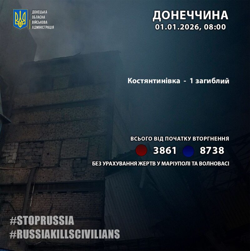“За 31 грудня росіяни вбили 1 жителів Донеччини – у Костянтинівці”, – зазначив він.