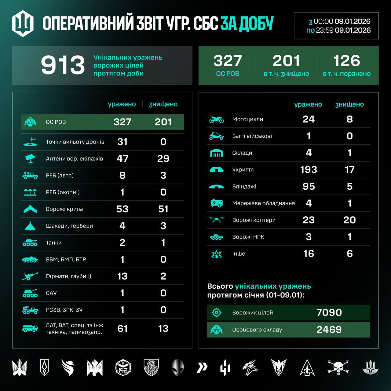 "Загалом упродовж січня (01–09.01) знищено/уражено 7090 цілей, з них – 2469 особовий склад противника", ідеться у повідомленні.