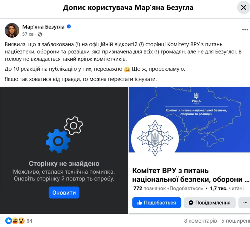 "Виявила, що я заблокована на офіційній відкритій сторінці Комітету ВРУ з питань нацбезпеки, оборони та розвідки, яка призначена для всіх громадян, але не для Безуглої. В голову не вкладається такий крінж комітетчиків", - зазначила Безугла.
