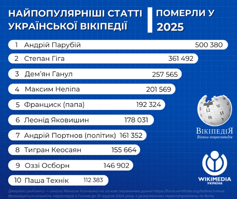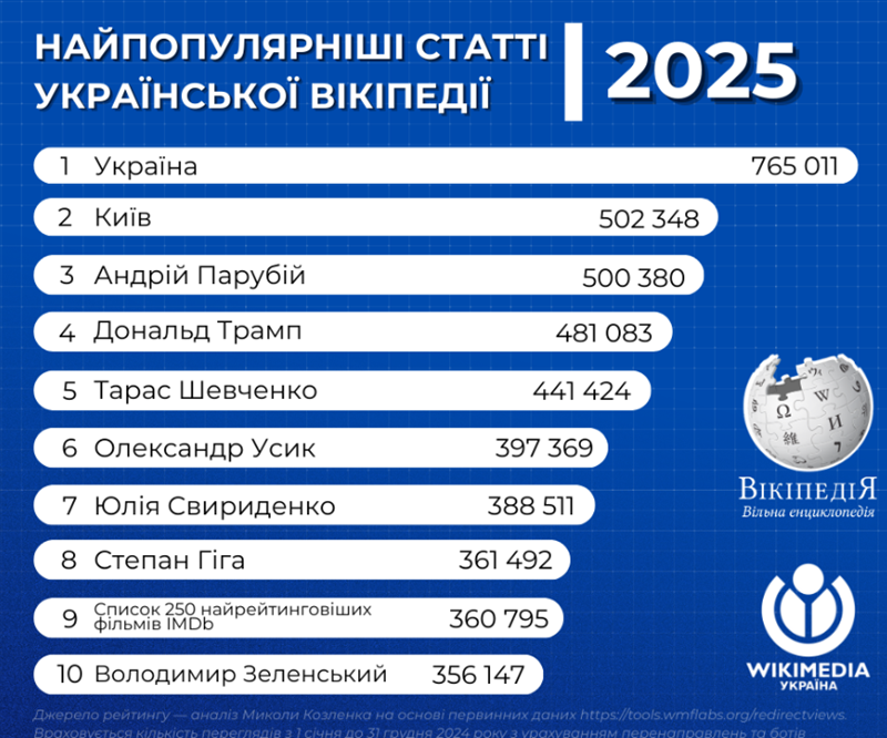 Найпопулярнішою статтею української "Вікіпедії" стала стаття "Україна" - у 2025 році її переглянули понад 765 тисяч разів. Друге та третє місце ділять статті про Київ та про вбитого ексспікера парламенту Андрія Парубія (близько 500 тисяч переглядів кожна). Також до топ-5 увійшли президент США Дональд Трамп і поет Тарас Шевченко.