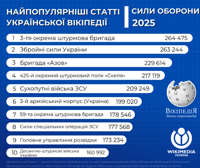 Українці традиційно багато читали у "Вікіпедії" про російсько-українську війну та Сили оборони України. Перше місце з-поміж цієї теми зайняла стаття про 3-тю штурмову бригаду (264 тисячі переглядів), далі - "Збройні сили України" (263 тисячі) та бригада "Азов" (229 тисяч).