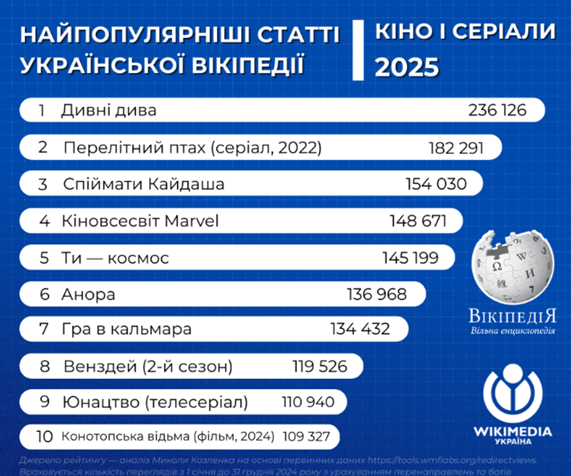 З-поміж статей про серіали найбільш популярними стали американський "Дивні дива" і український "Спіймати Кайдаша" (236 тисяч і 154 тисячі переглядів відповідно), а найпопулярнішим фільмом виявився український "Ти - космос" (145 тисяч).