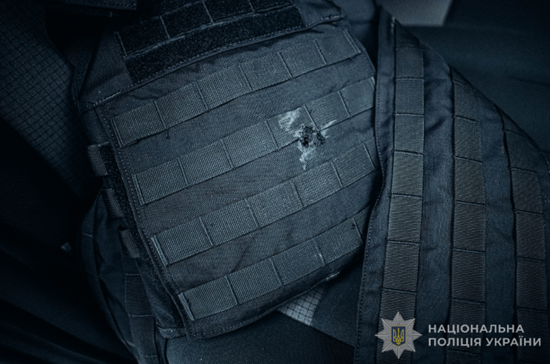 Поліцейські зреагували миттєво. Один із них підскочив до зловмисника і прикрив собою жінку з дитиною. У цей момент фігурант здійснив постріл. На щастя, дріб застряг у бронежилеті.