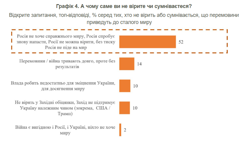 Респондентам, які відповіли, що не вірять, що перемовини приведуть до миру (або не визначилися), ставилося додаткове запитання – їх просили у відкритій формі відповісти, чому вони так вважають. Більшість таких респондентів (52%) пояснюють те, що вони не вірять в успіх перемовин, тим, що Росія не хоче справжнього миру, що Росія планує продовжувати війну далі тощо.