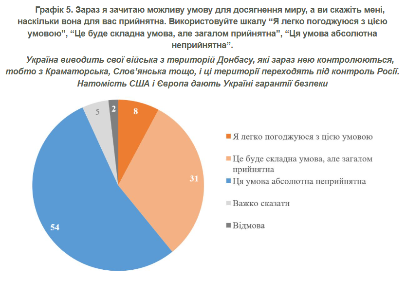 Водночас більшість українців – 54% – вважають категорично неприйнятним передати під контроль Росії весь Донбас в обмін на гарантії безпеки. Готові на таку поступку – 39% (хоча з них більшість визнають, що це є складною умовою). Ще 5% не змогли визначитися із своєю думкою.