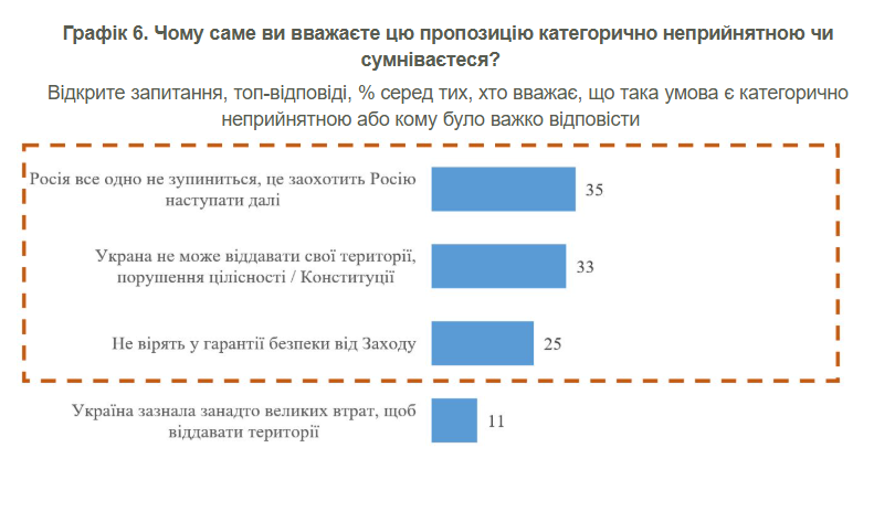 Респондентам, для яких така умова є категорично неприйнятною (або які засумнівалися з відповіддю), ставилося додаткове запитання у відкритій формі, чому вони так вважають. Найпопулярніша відповідь - Росія все одно не зупиниться і буде намагатися воювати проти України далі (35%).