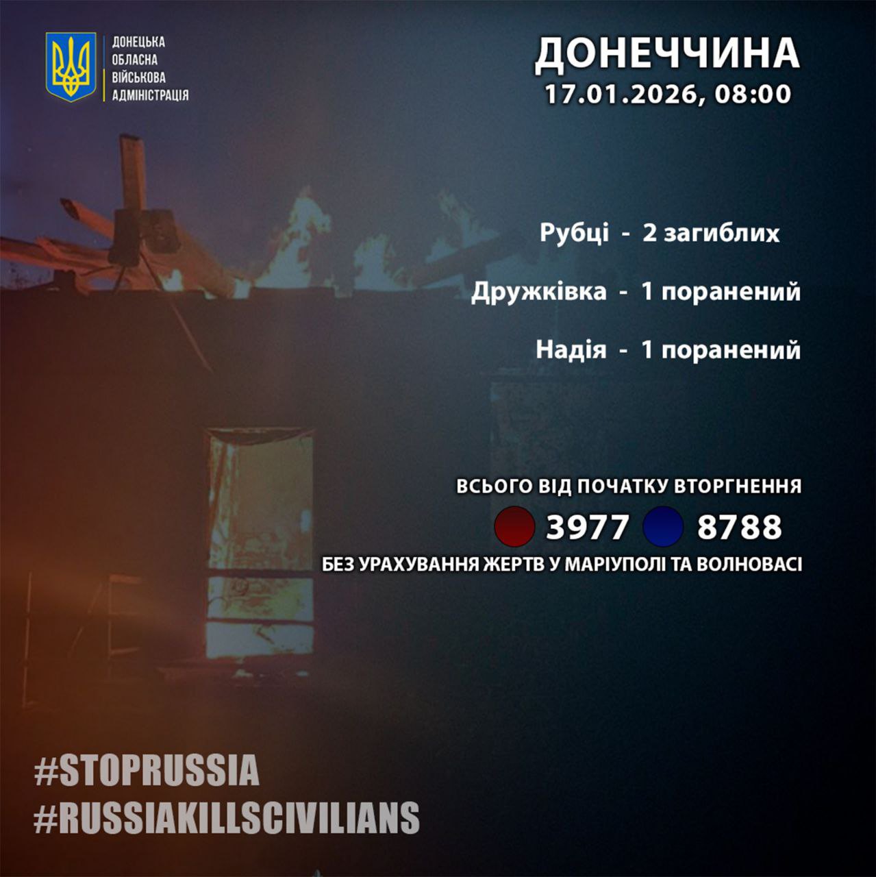 "За 16 січня росіяни вбили 2 жителів Донеччини — у Рубцях. Ще 2 людини в області за добу дістали поранення", — ідеться у повідомленні.