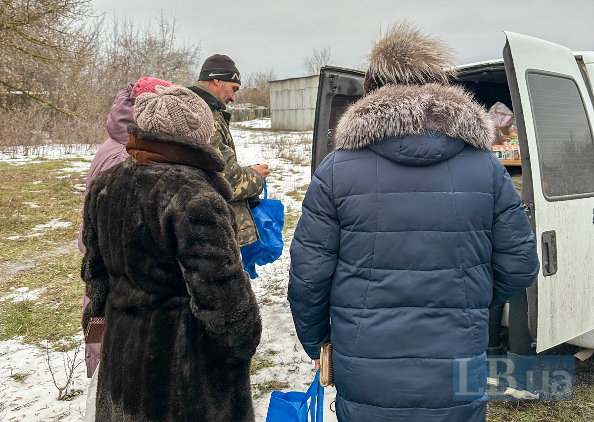 В селі Українка на Ларису з продуктами чекало пʼятеро людей. Вони трохи замерзли, але прийшли раніше, аби не пропустити закупи.