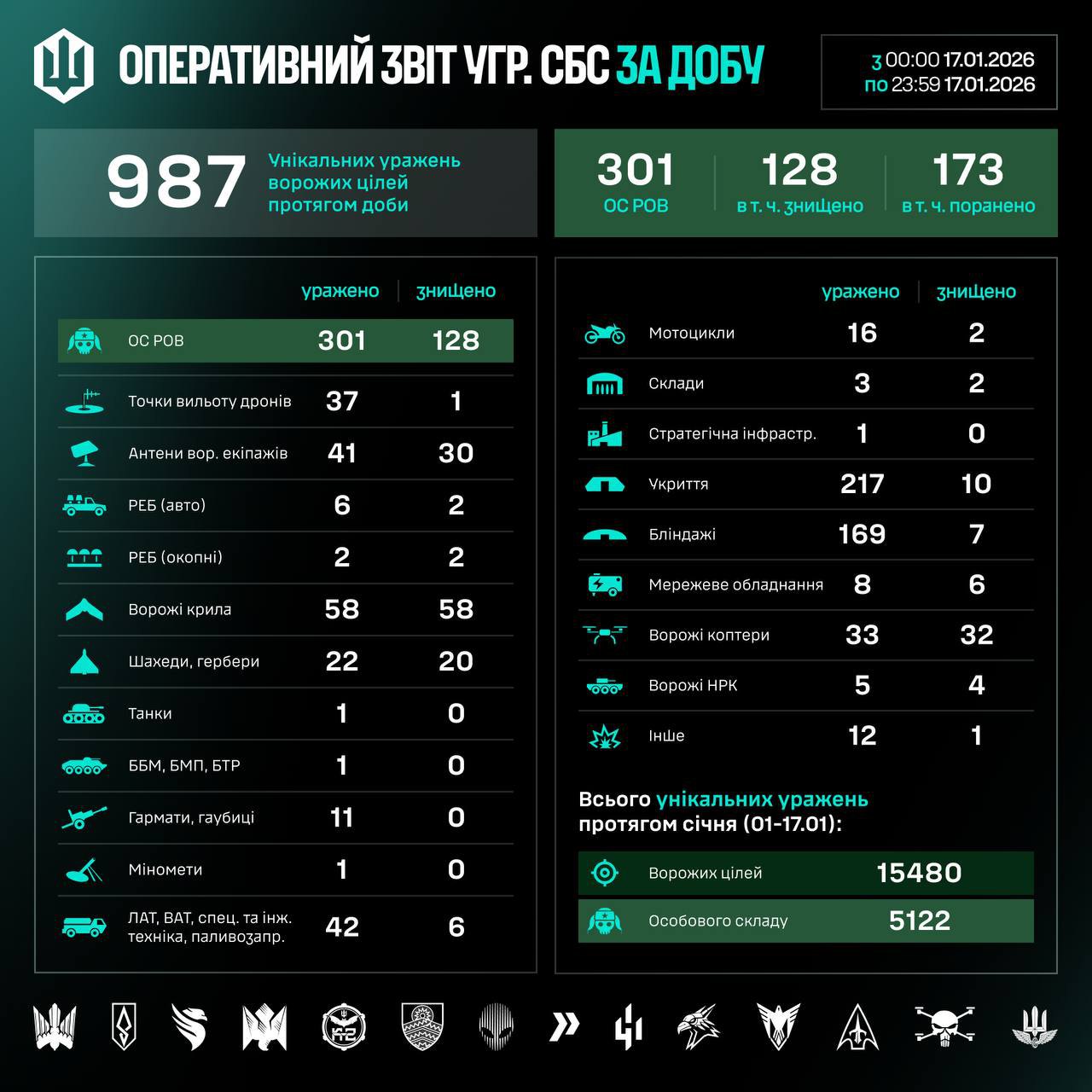 "Загалом упродовж січня (01–17.01) знищено/уражено 15480 цілей, з них – 5122 особовий склад противника", – ідеться у повідомленні.