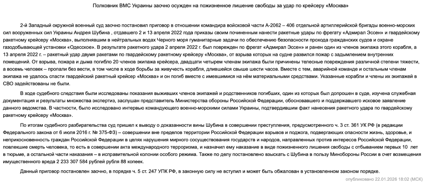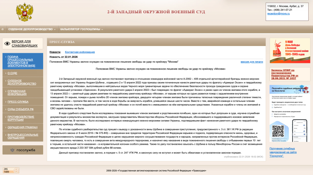2-й Західний окружний військовий суд, розташований у Москві, ухвалив “вирок” у справі про затоплення крейсера: командира 406 артилерійської бригади ВМС України Андрія Шубіна заочно засудили до довічного строку за статтею про міжнародний тероризм, передає «Медіазона».